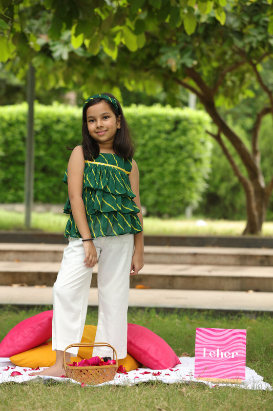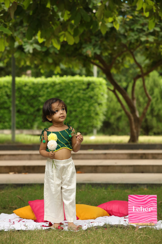 Short peplum top and sunset coloured flared pants is perfect outfit for Indian festivities, family...