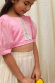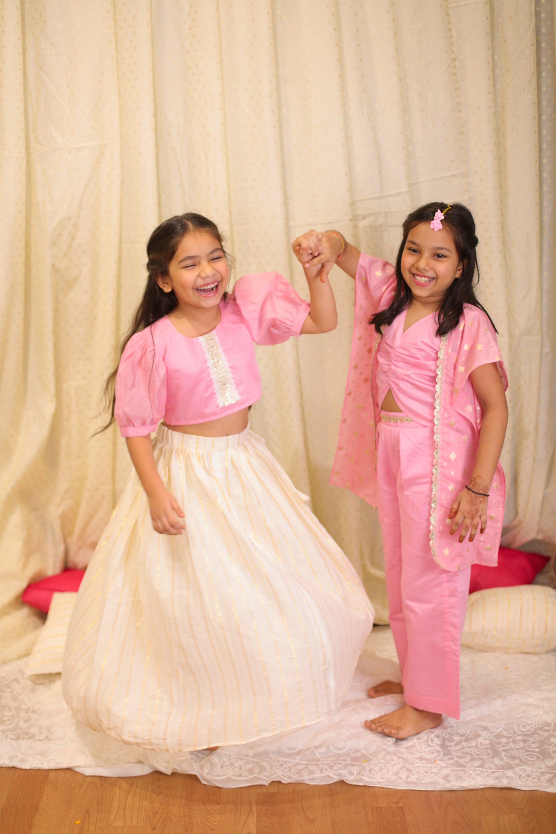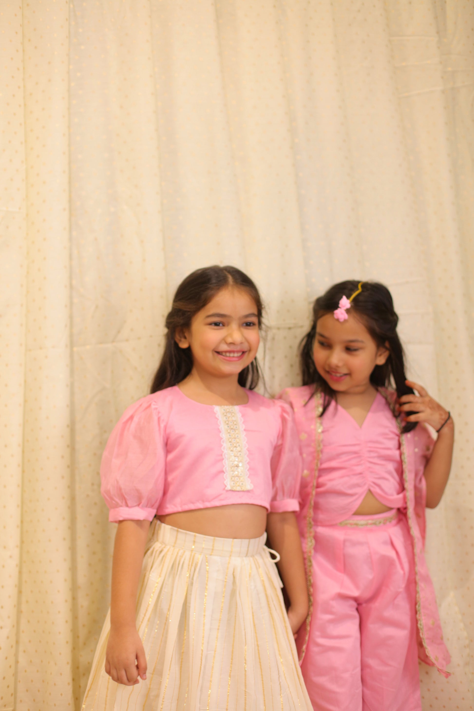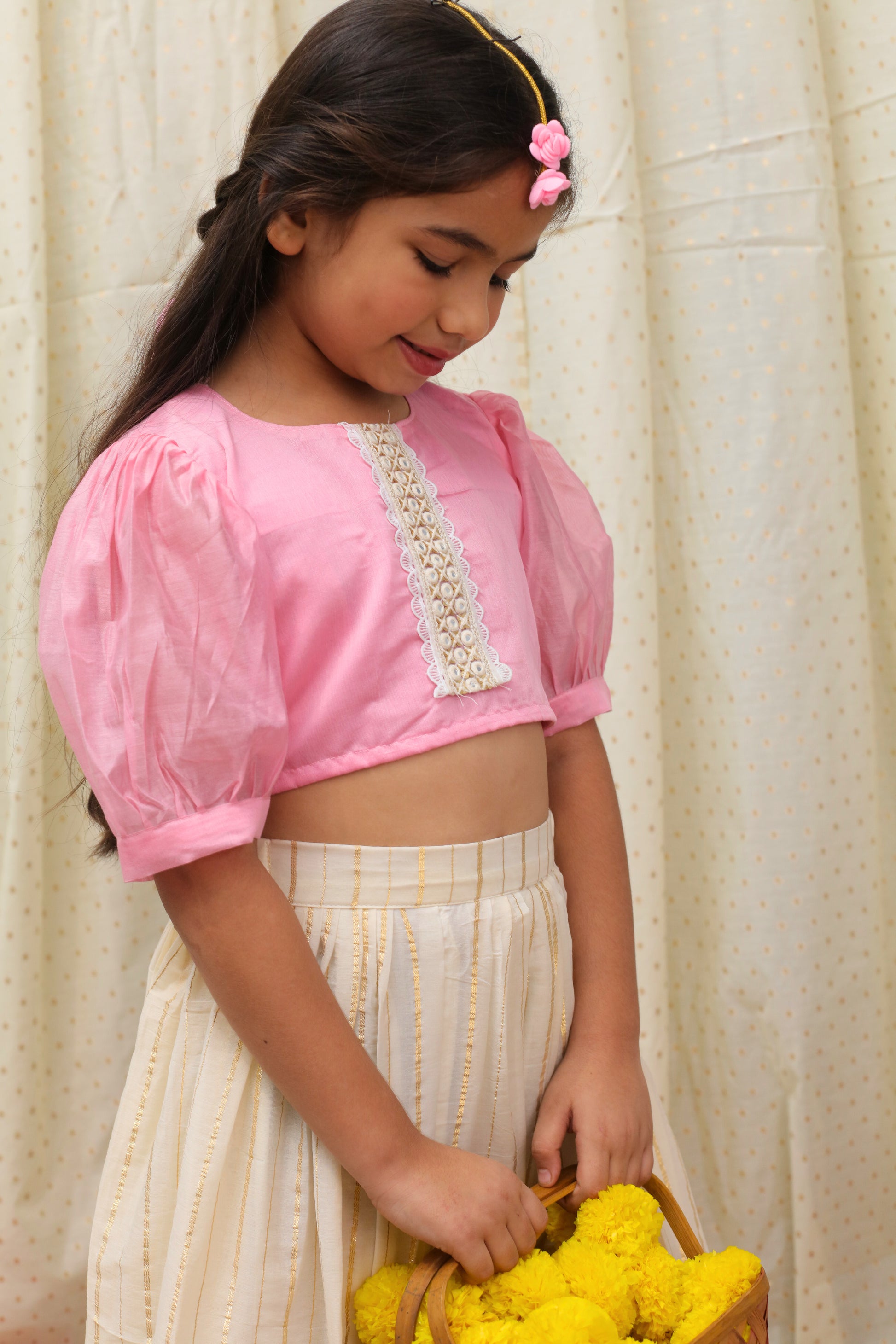 This adorable skirt set will add a touch of sweetness to your little princess outfit. This blouse top with a round neckline and mirror lace detailing. The set features a comfortable fit and an elastic waistband. This blouse top is composed in Chanderi and the skirt is made in muslin . Pair this set with a cute hair band or a bowpin from our collection for a complete look.