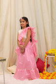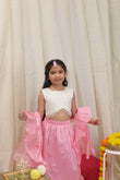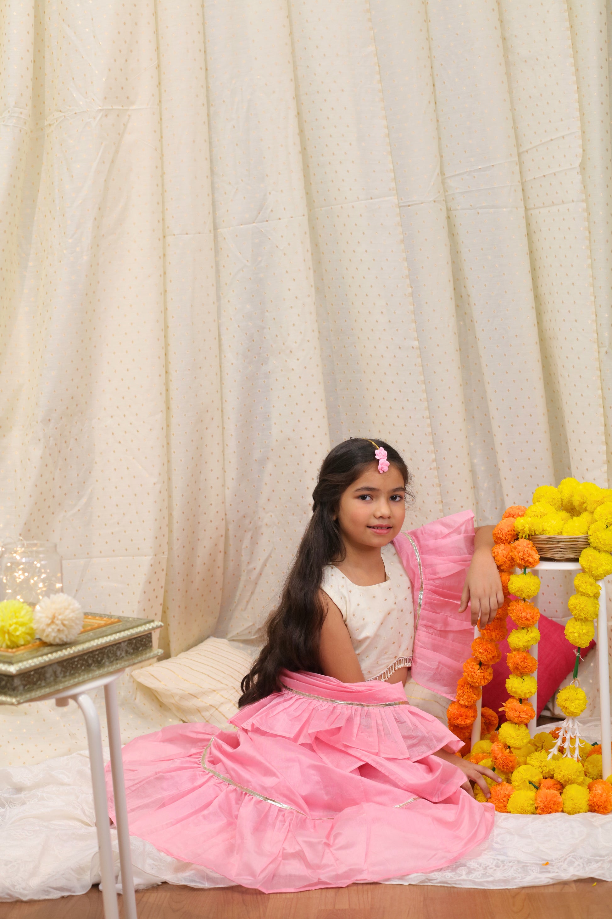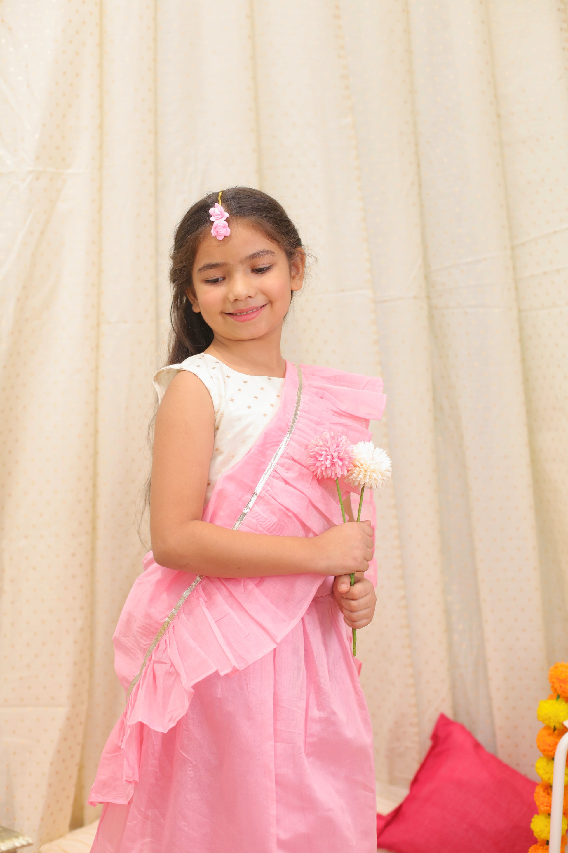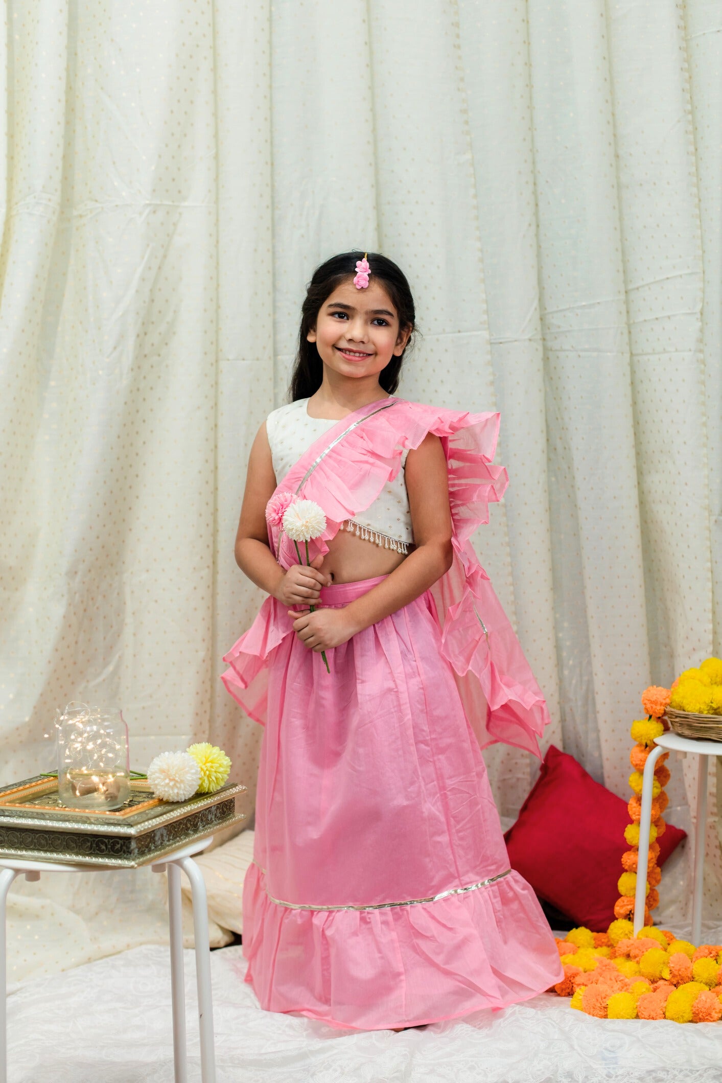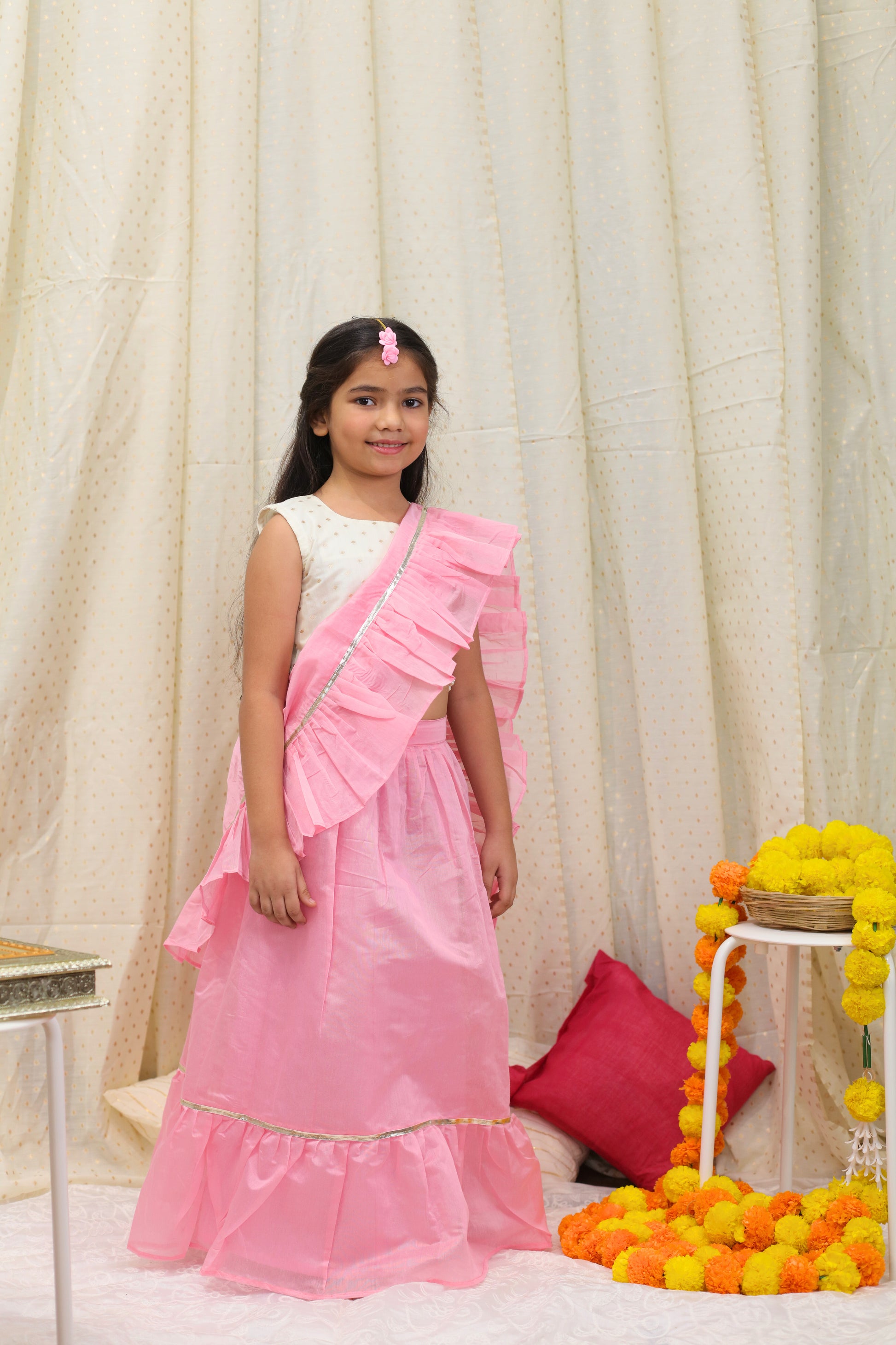 Buy this quirky yet stylish saree cum lehenga set for your kid and allow her to be the fashionista this wedding and festive season. It is made of chanderi and the style is extremely comfortable to carry. It also features blouse top with hanging detailing , skirt and a stylish dupatta. Combine it with a jutti, a mangtika and a bowpin to complete the outfit.