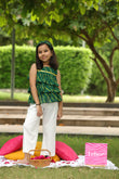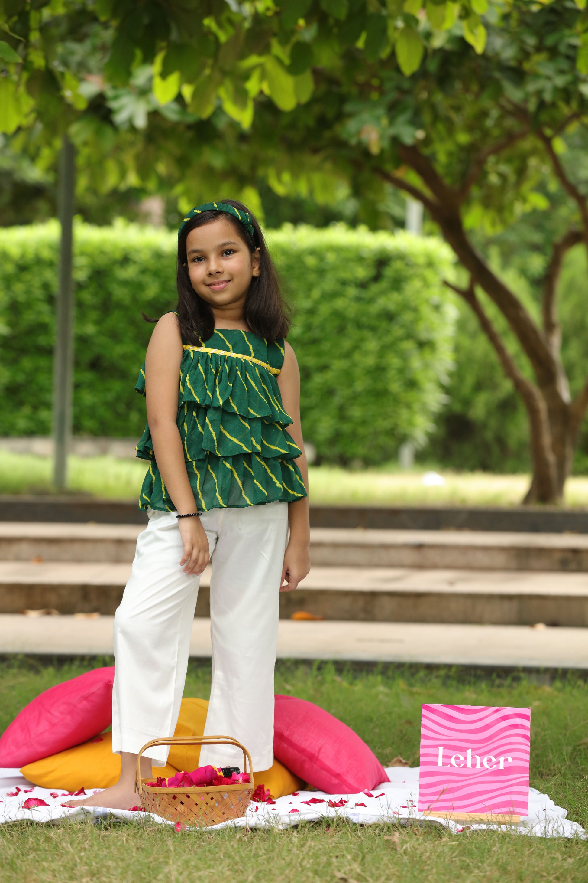 Get your little one ready for any traditional occasion or formal event with this easy style. Undeniably stylish and hassle free style. The combination of a green leheriya printed tie up strap top with dainty detailing and white cotton silk pants featuring an elastic waist. Wear it with a jutti and a beautiful hairband to enhance the look.