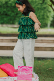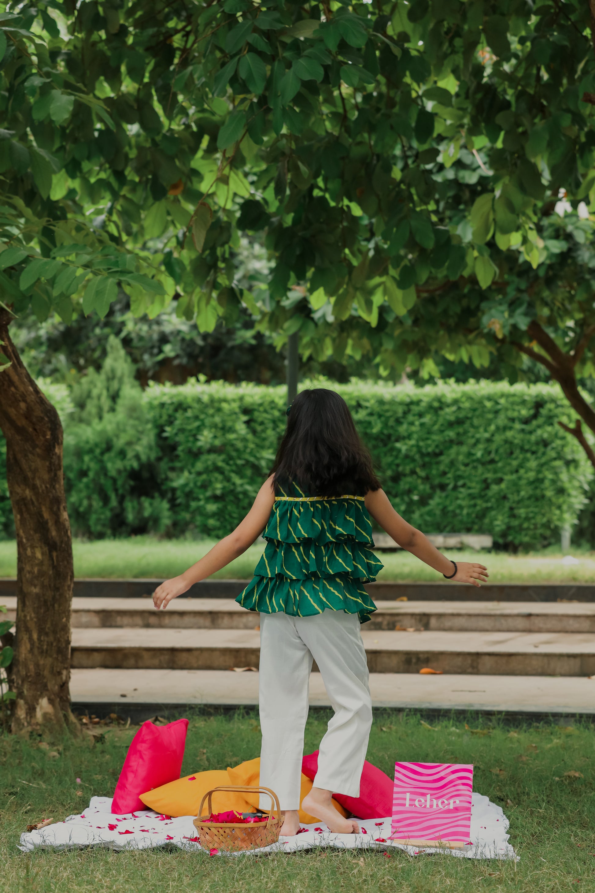 Green Leheriya Printed Frilled Three Tiered Top And Pants