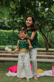 Get your little one ready for any traditional occasion or formal event with this easy style. Undeniably stylish and hassle free style. The combination of a green leheriya printed tie up strap top with dainty detailings and white cotton silk pants featuring an elastic waist. Wear it with a juttie and a beautiful hairband to enhance the look.