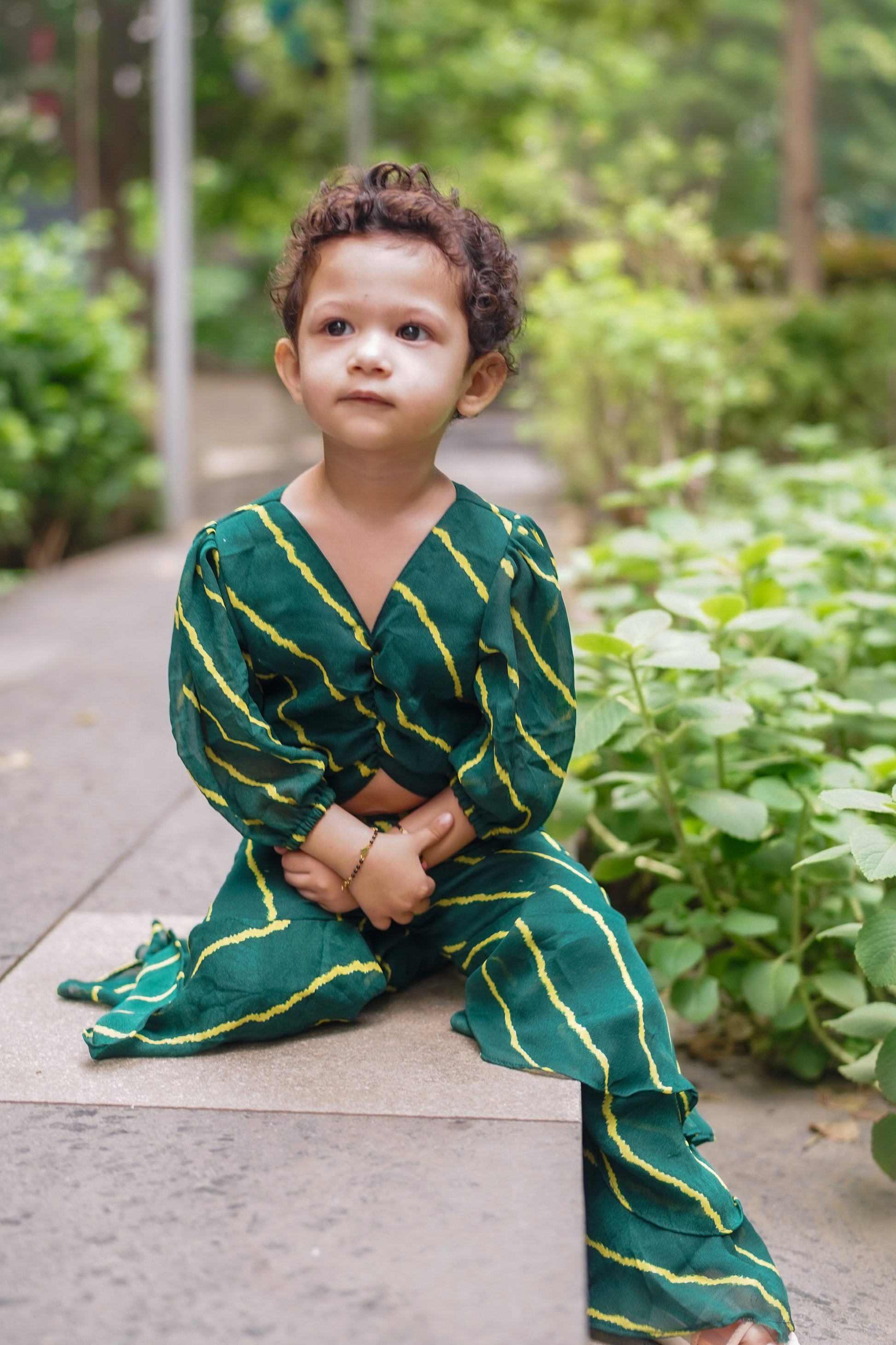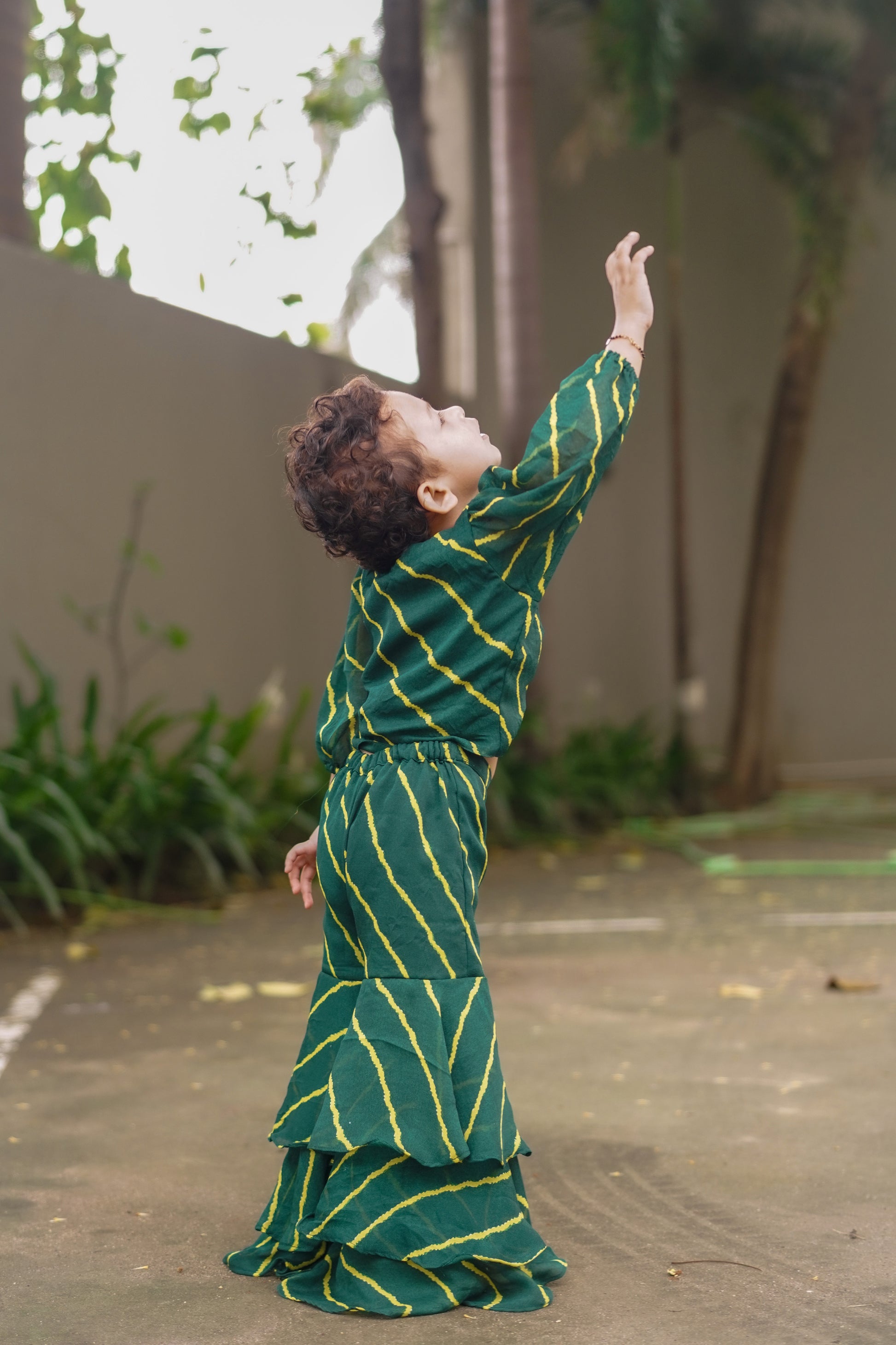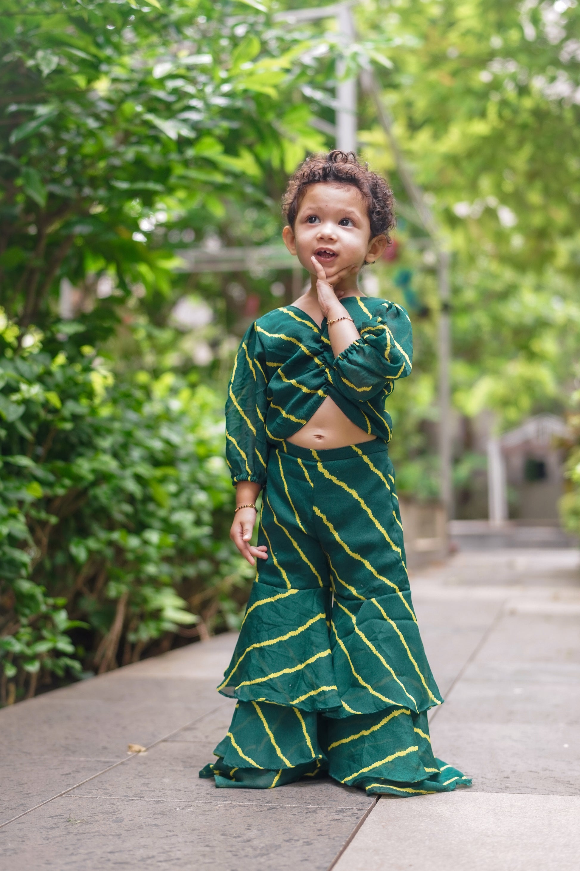 Get your little one ready for any traditional occasion or formal event with this beautiful set. Undeniably stylish and elegant, the ensemble is awash with grace. The combination of three tiered sharara and puff sleeves statement top is a perfect playful style.