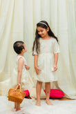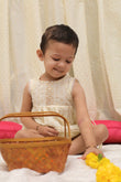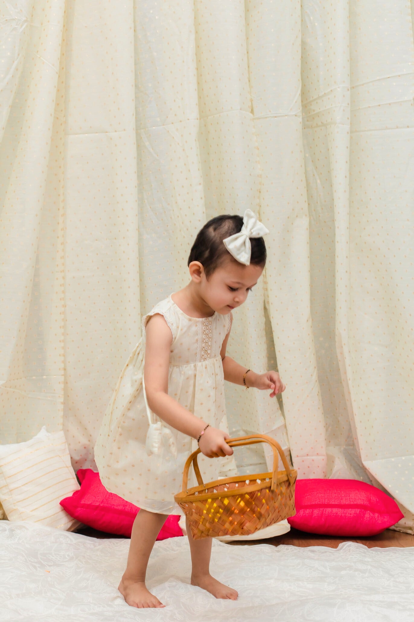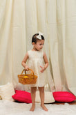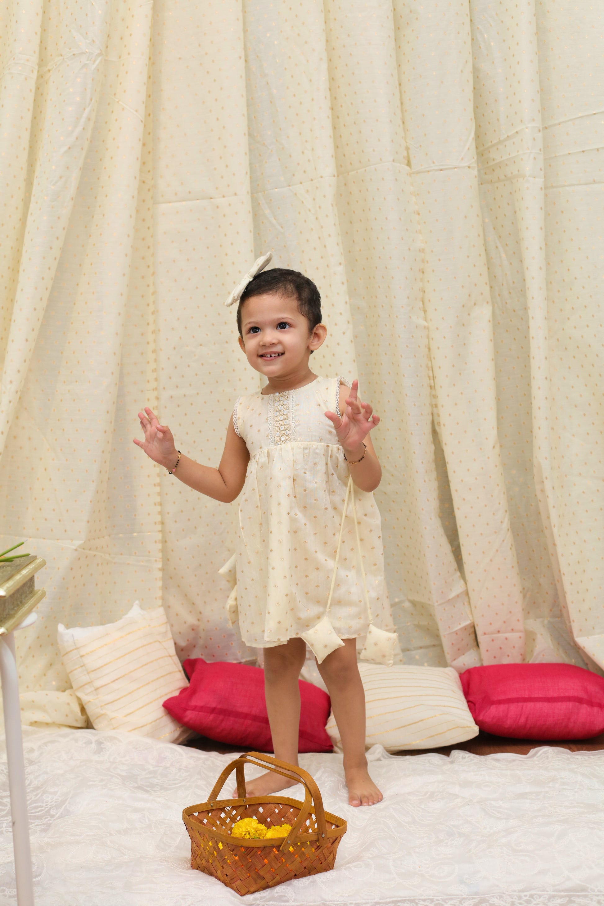 The whole dress is crafted to provide the comfort your younger one seeks. The dress with a round neckline with dainty lacing and hangings that keeps your child playful all day long. Bag the perfect fit for your little princess.