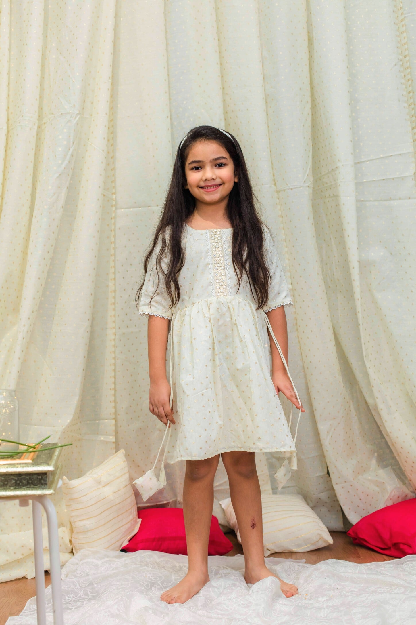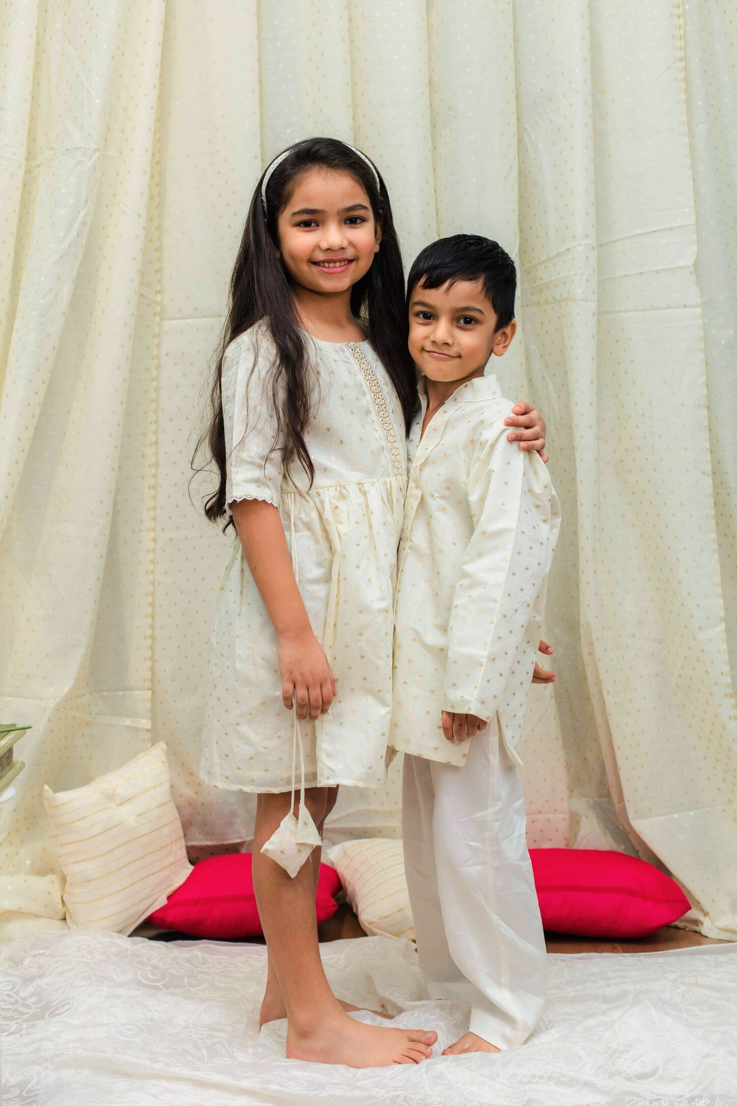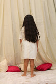 The whole outfit is crafted to provide the comfort your younger one seeks. The kurta with a v neckline, flared sharara and matching dupatta that keeps your child playful all day long. Bag the perfect fit for your little princess.