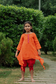 Orange flared tunic and vibrant dhoti pants is a perfect mix between ethnic and fun. This versatile piece of clothing can be worn on denims/pants and the dhoti can be clubbed with other tops and tshirts for a casual look.
