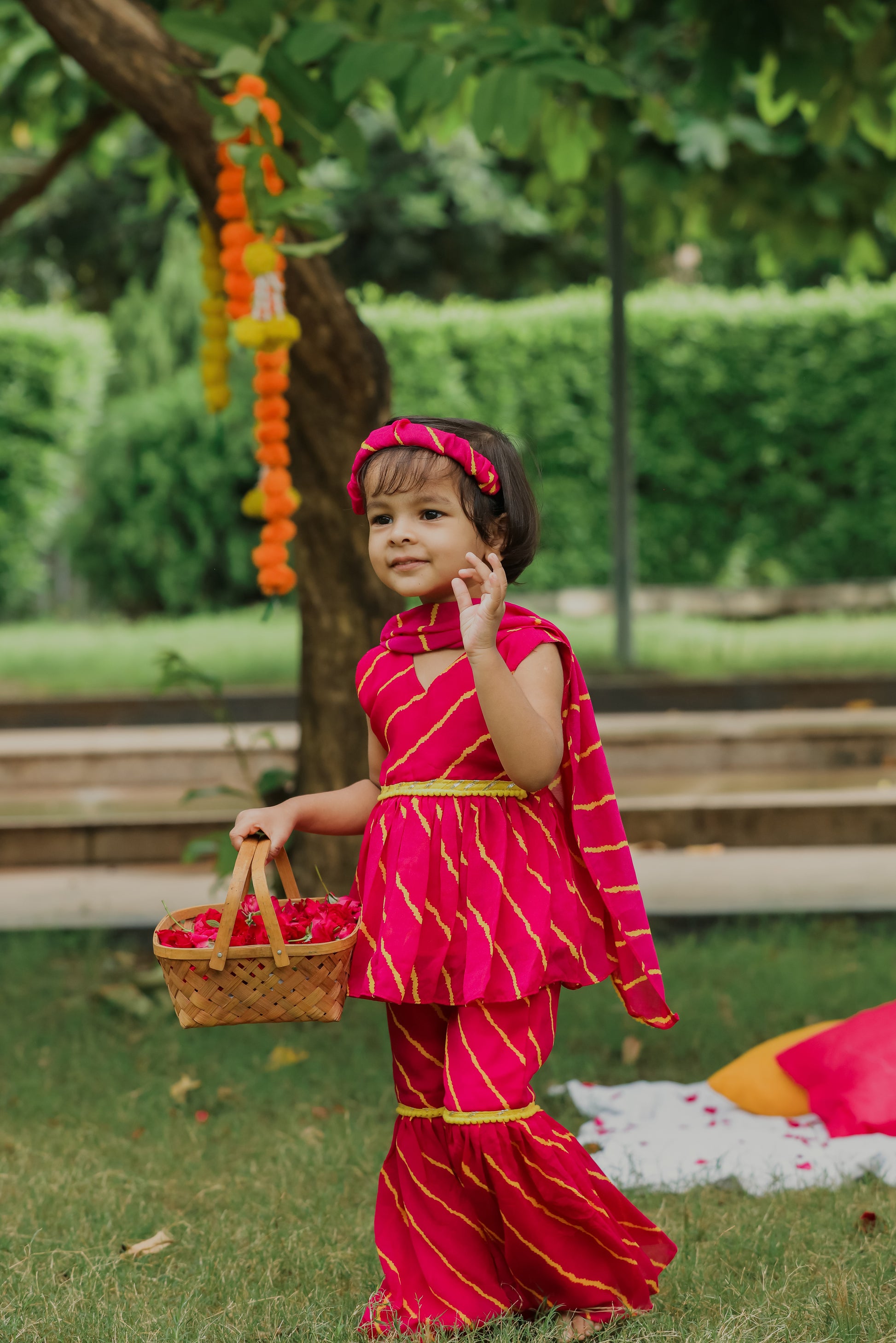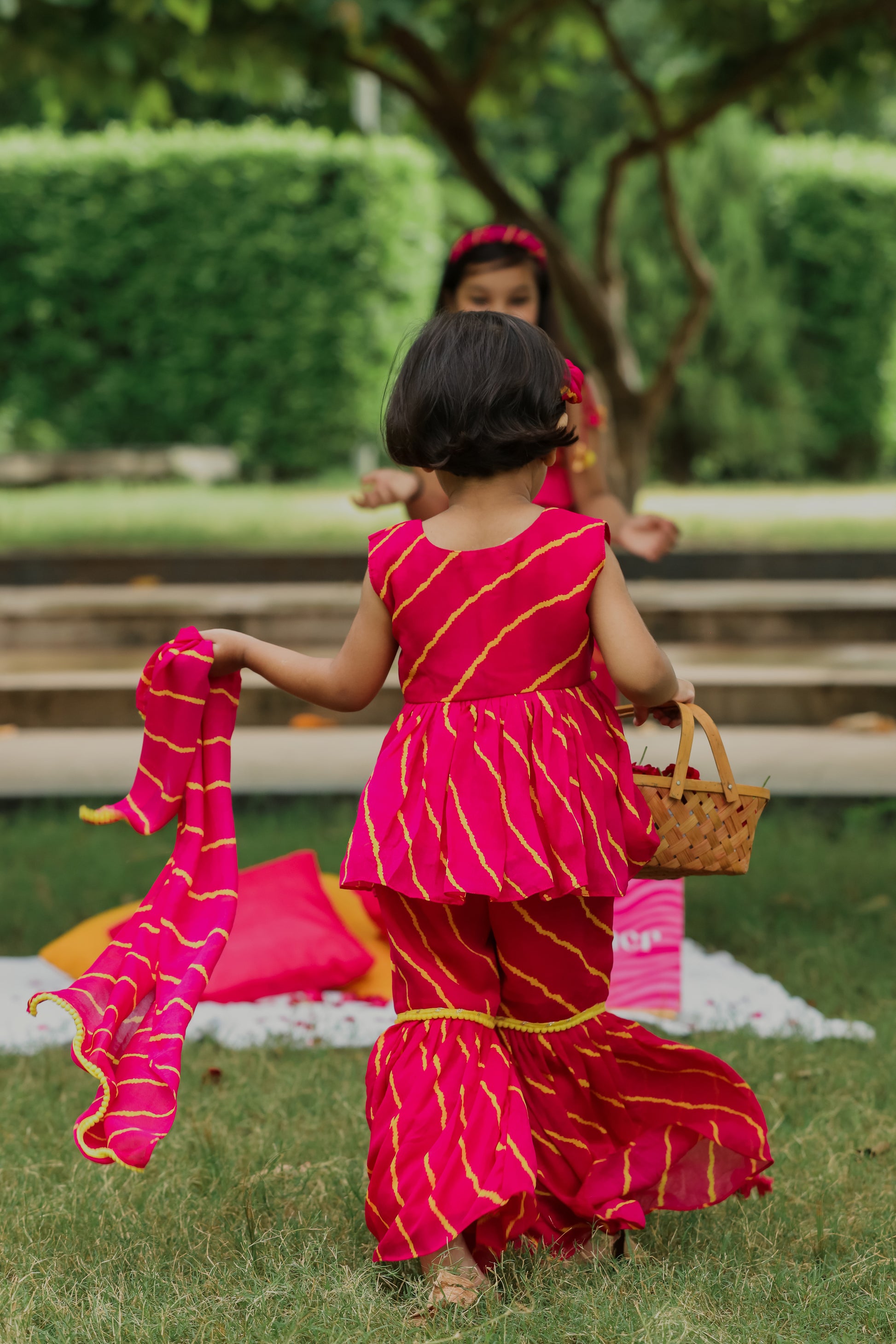 Pink Leheriya Printed Peplum Kurta, Sharara And Dupatta Set
