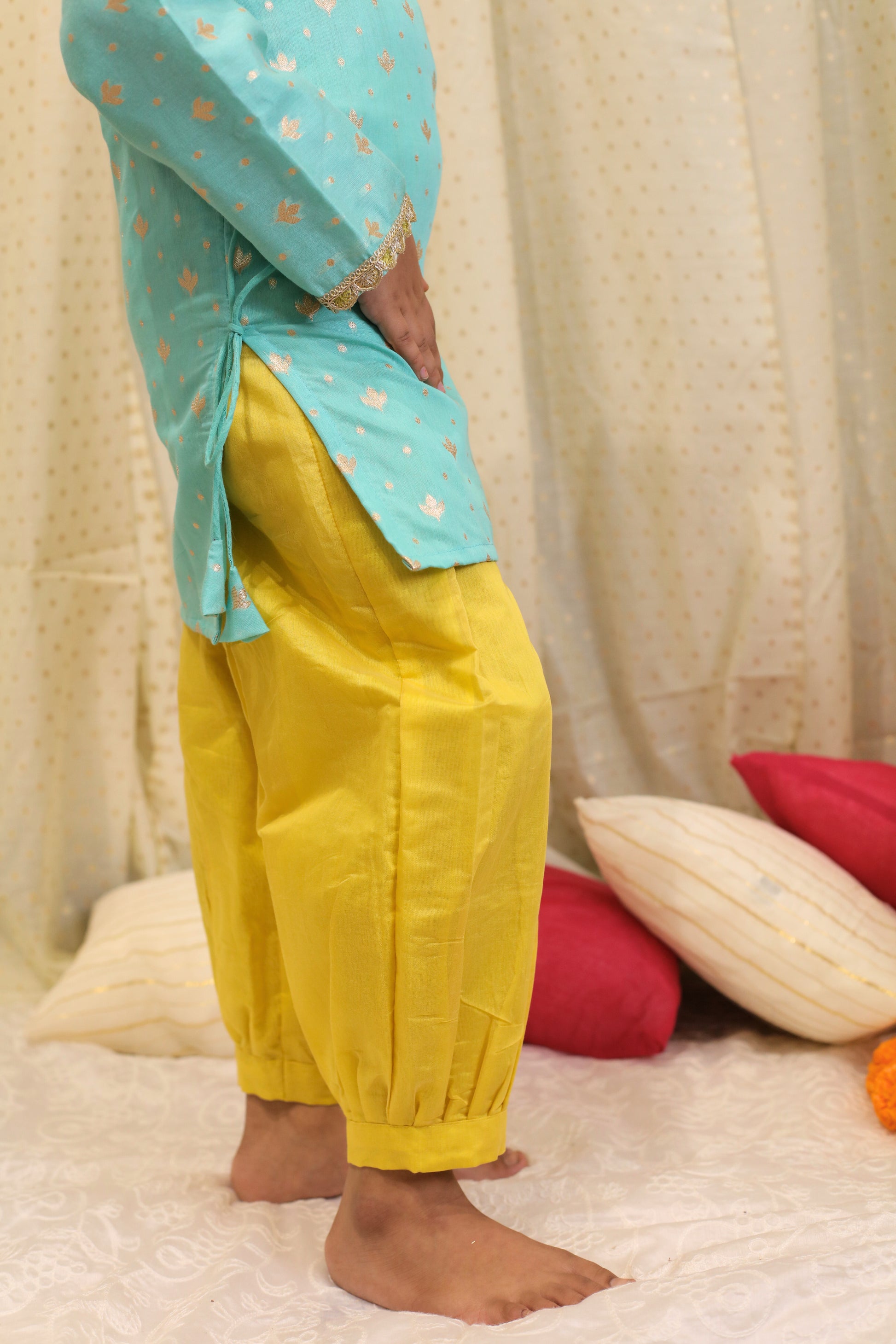 Rama blue kurta and vibrant dhoti pants is a perfect mix between ethnic and fun. This versatile piece of clothing can be worn on denims/pants and the dhoti can be clubbed with other tops and tshirts for a casual look.