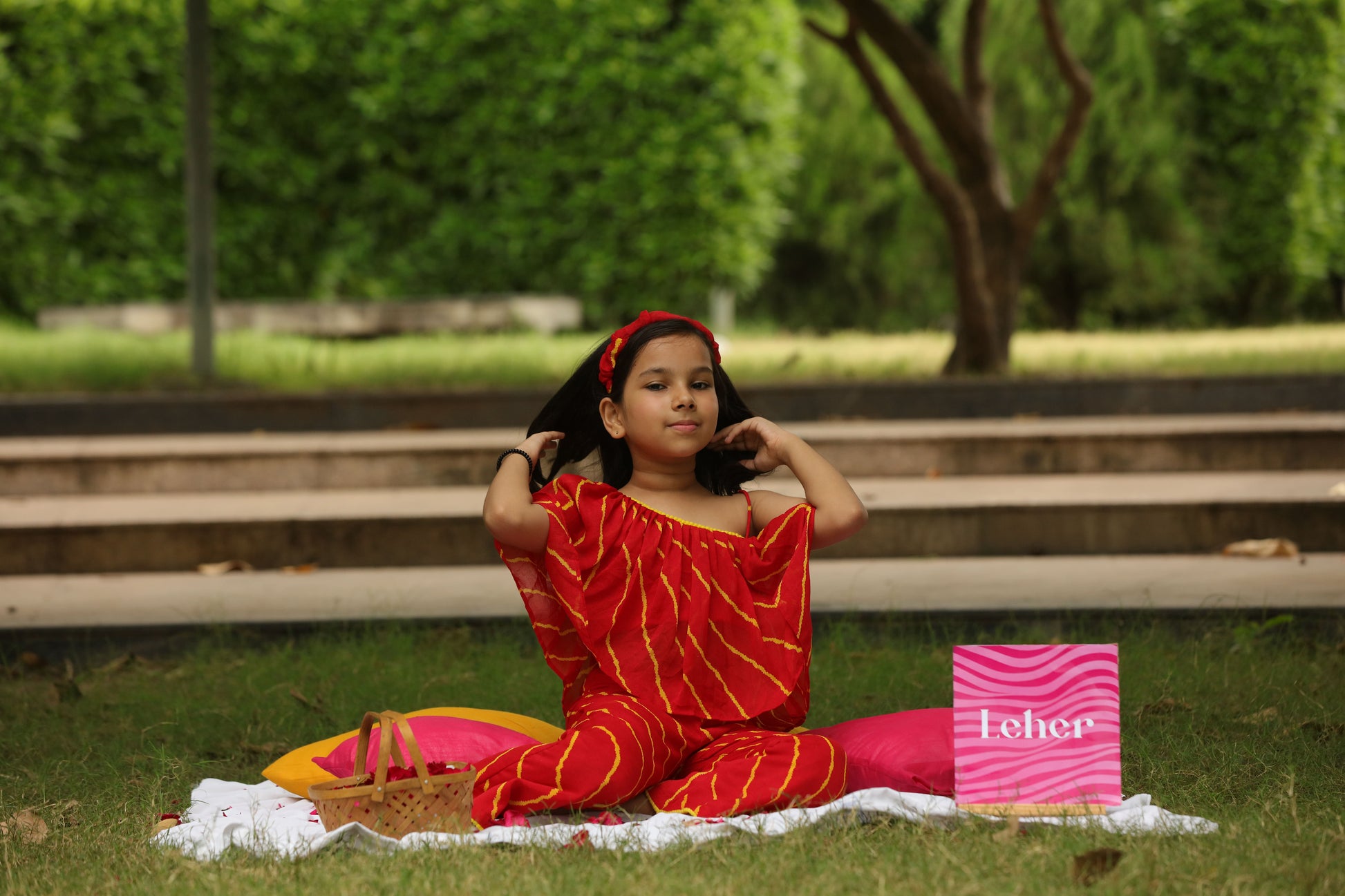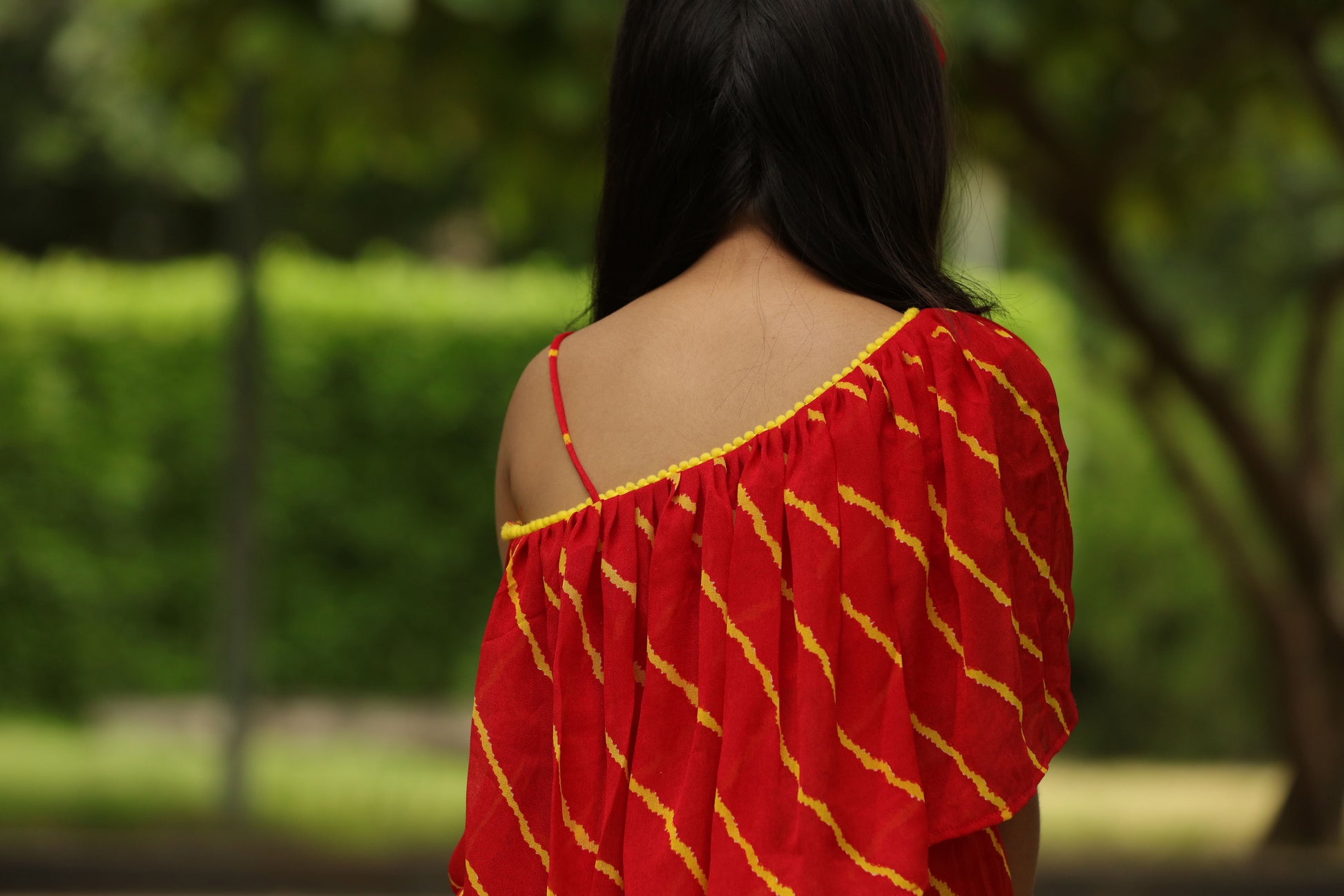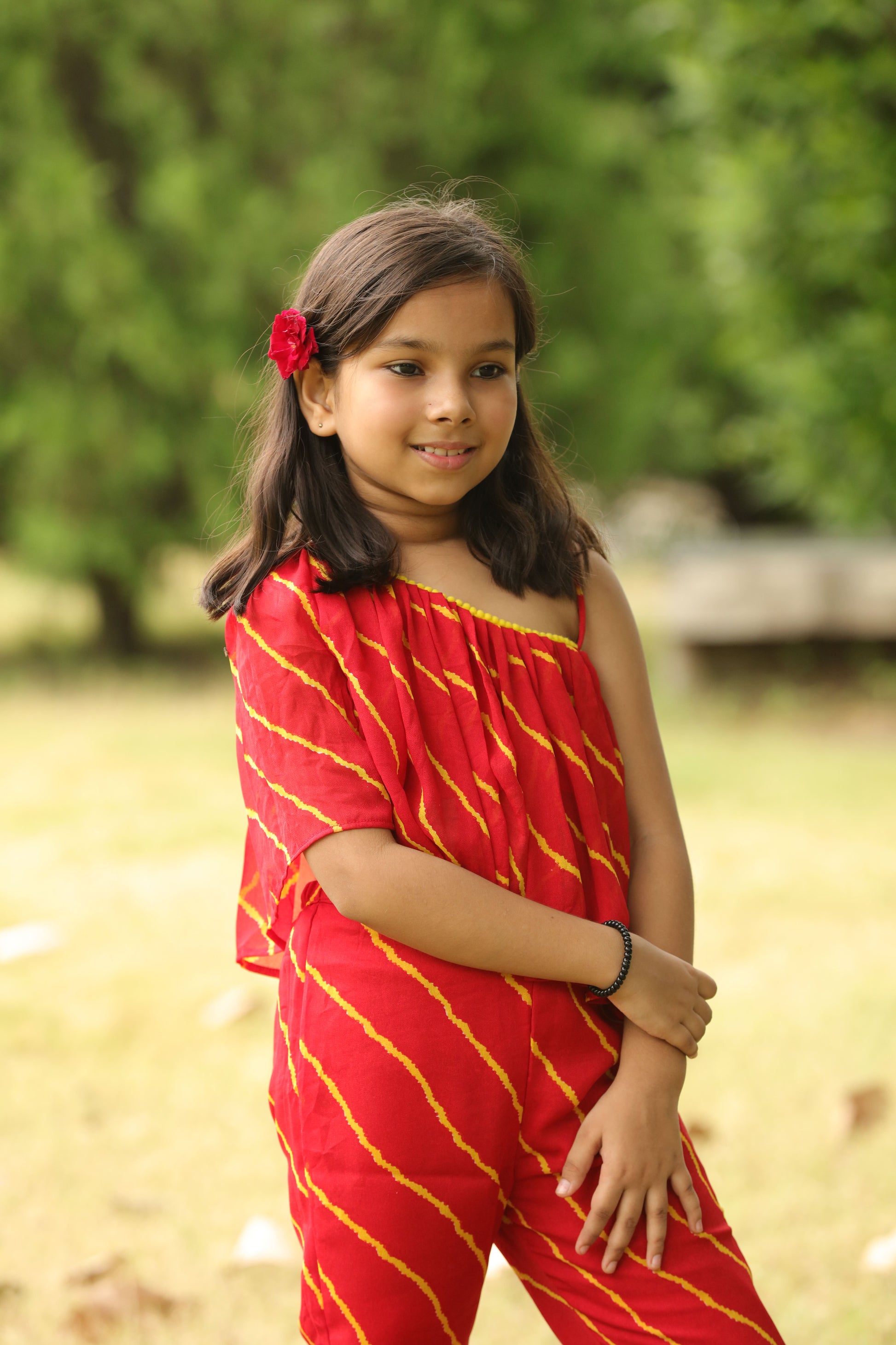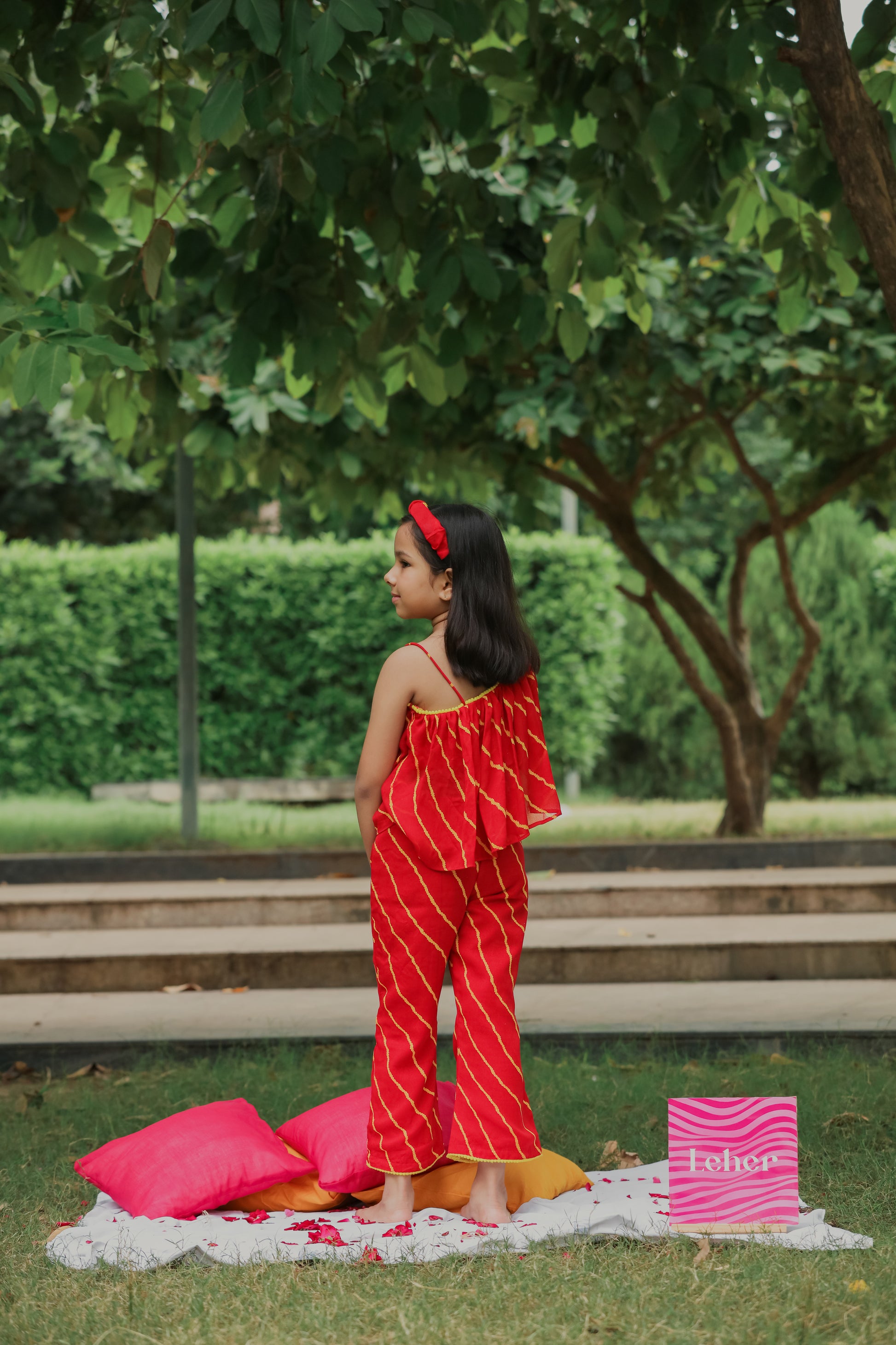 Red Leheriya Printed One Shoulder Top And Flared Pants
