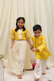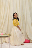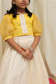 This adorable skirt set will add a touch of sweetness to your little princess outfit. This blouse top with a round neckline and mirror lace detailing. The set features a comfortable fit and an elastic waistband. This blouse top is composed in Chanderi and the skirt is made in muslin . Pair this set with a cute hair band or a bowpin from our collection for a complete look.
